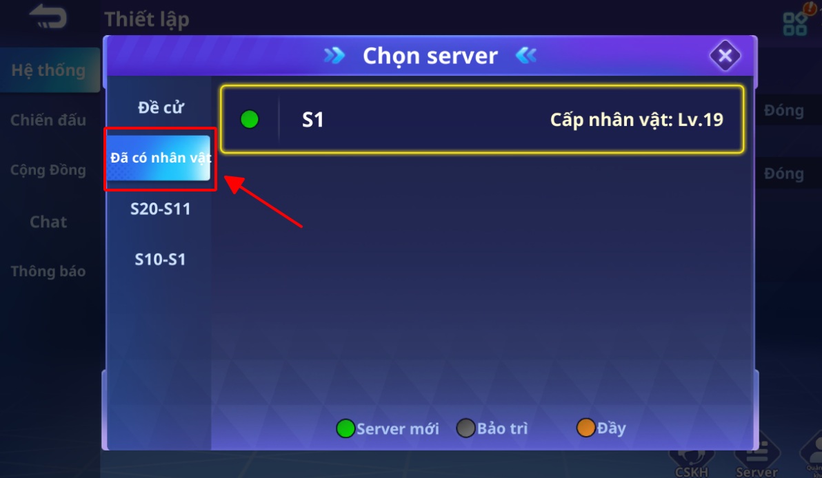 - Tại mục Đã Có Nhân Vật sẽ thể hiện Sever và cấp độ của Shooter