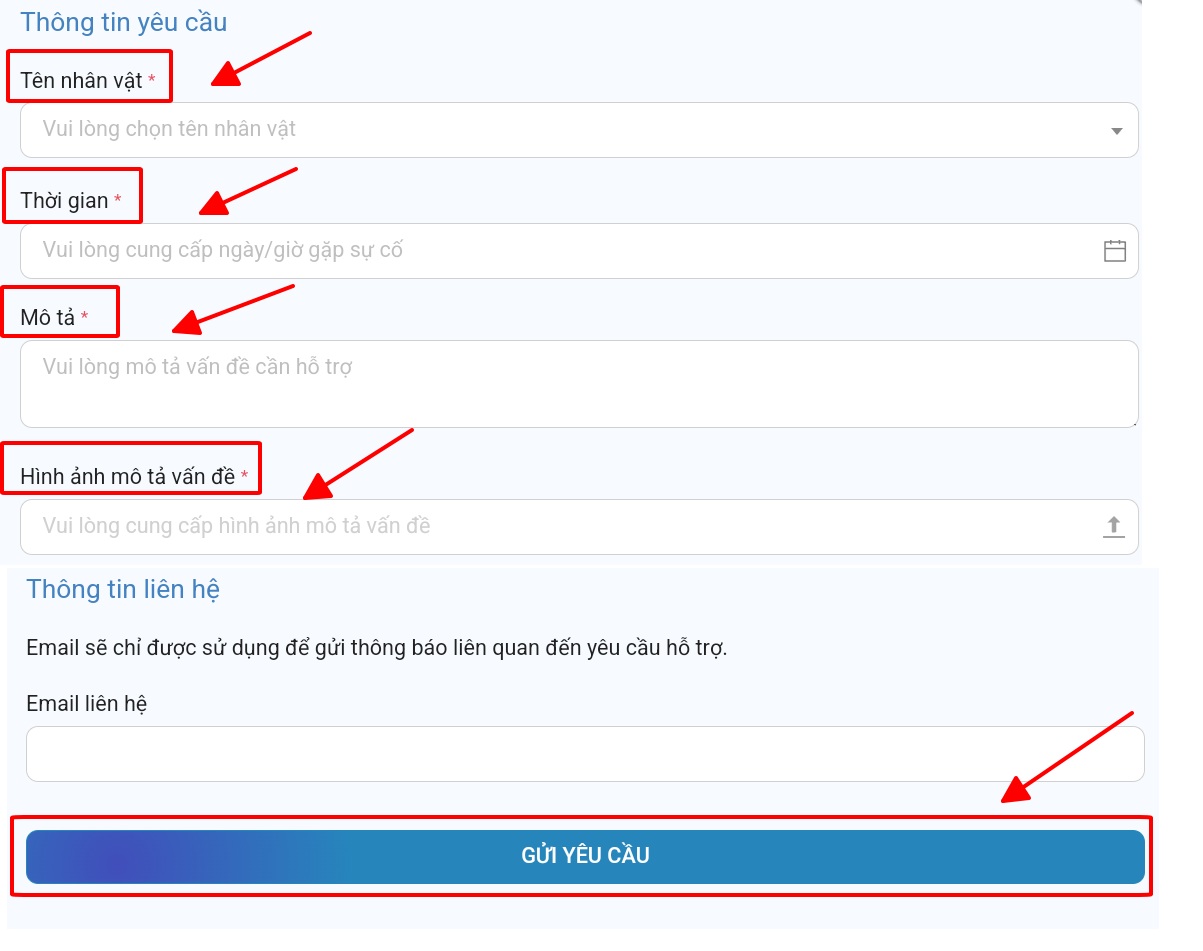 Bước 4: Điền các thông tin cần thiết và vấn đề của Shooter đang gặp phải -> nhấn gửi yêu cầu