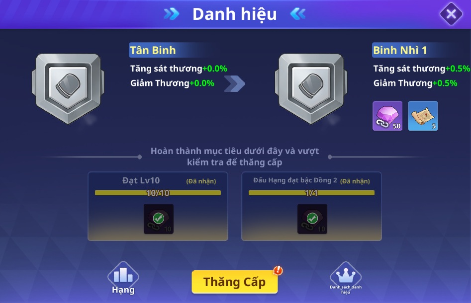Đừng quên hoàn thành các nhiệm vụ Danh Hiệu để nhận các phần quà giá trị và các chỉ số thêm cho nhân vật tăng lực chiến