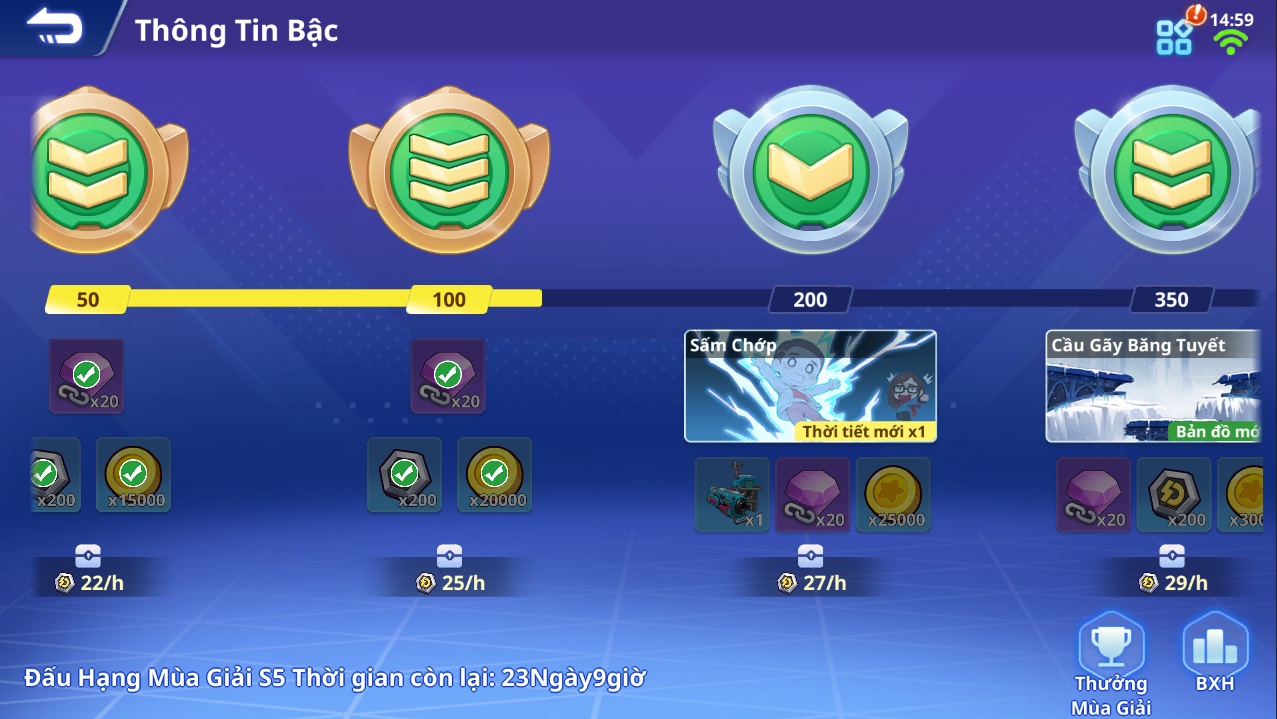 Tham gia tranh tài các trận đấu hạng để nhận được điểm bậc cao hơn cùng với những phần quà kèn theo như: mảnh vũ khí, kim cương khóa, xu sao, bản đồ khiêu chiến, ...