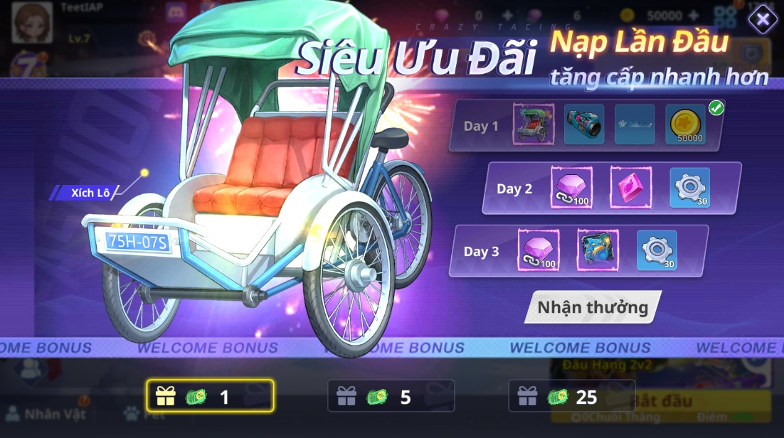 Ưu đãi quà nạp lần đầu cực kỳ hấp dẫn với Ảo Hóa Cánh - Xích Lô và Vũ Khí Pháo Tuyết nhận ngay ngày 1 khi nạp lần đầu