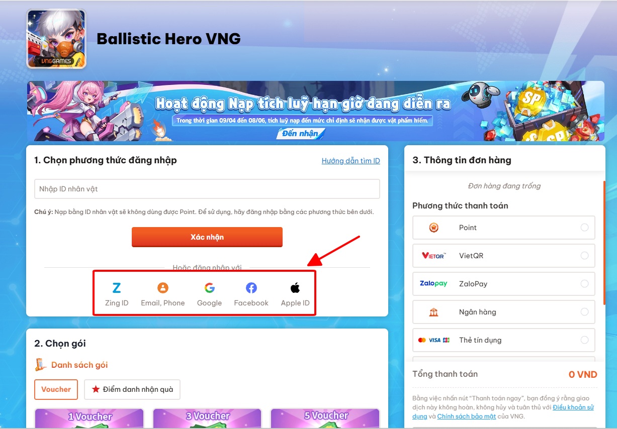 Bước 1: Shooter đăng nhập VNG Webshop Tại Đây => Chọn kênh liên kết đã được sử dụng cho Tài Khoản của mình