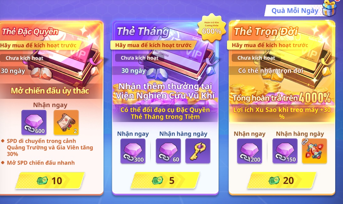 🎉 Nội dung: Mua trực tiếp các thẻ để nhận các vật phẩm ngay tức thì và những quyền lợi dài hạn theo ngày và trọn đời