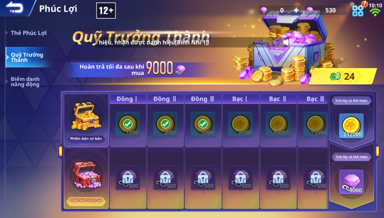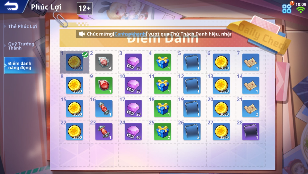 🎉 Nội dung: Đăng nhập mỗi ngày, điểm danh để nhận được các phần quà hấp dẫn như Vàng, Kim Cương Khóa, Đá Cường Hóa,...
