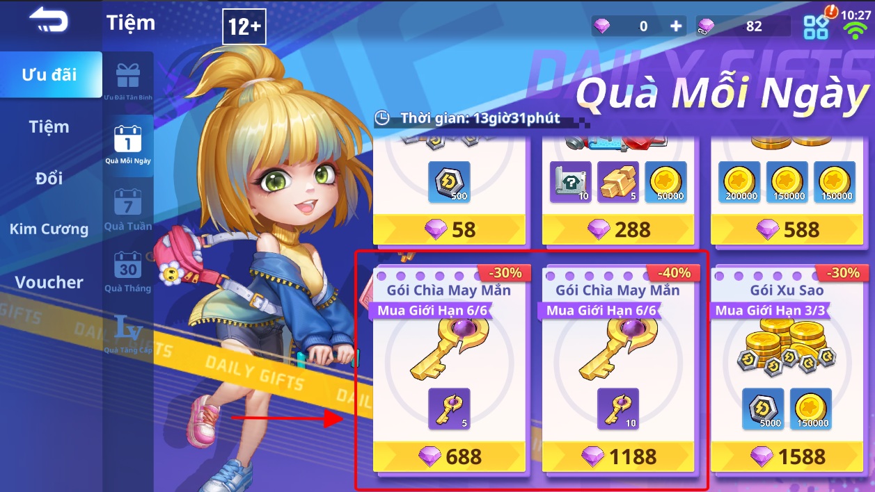 Chìa May Mắn: có thể kiếm được qua hoạt động sử dụng Kim Cương và Voucher ở các Event trong Tiệm