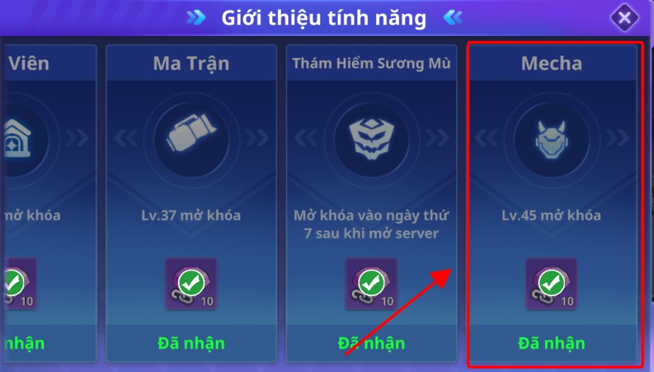 + Yêu cầu: Khi nhân vật Shooter đạt Level 45, tính năng Mecha sẽ được mở khóa. Shooter có thể kiểm tra cột mốc tính năng đạt được ở mục Giới Thiệu Tính Năng ngay màn hình chính.