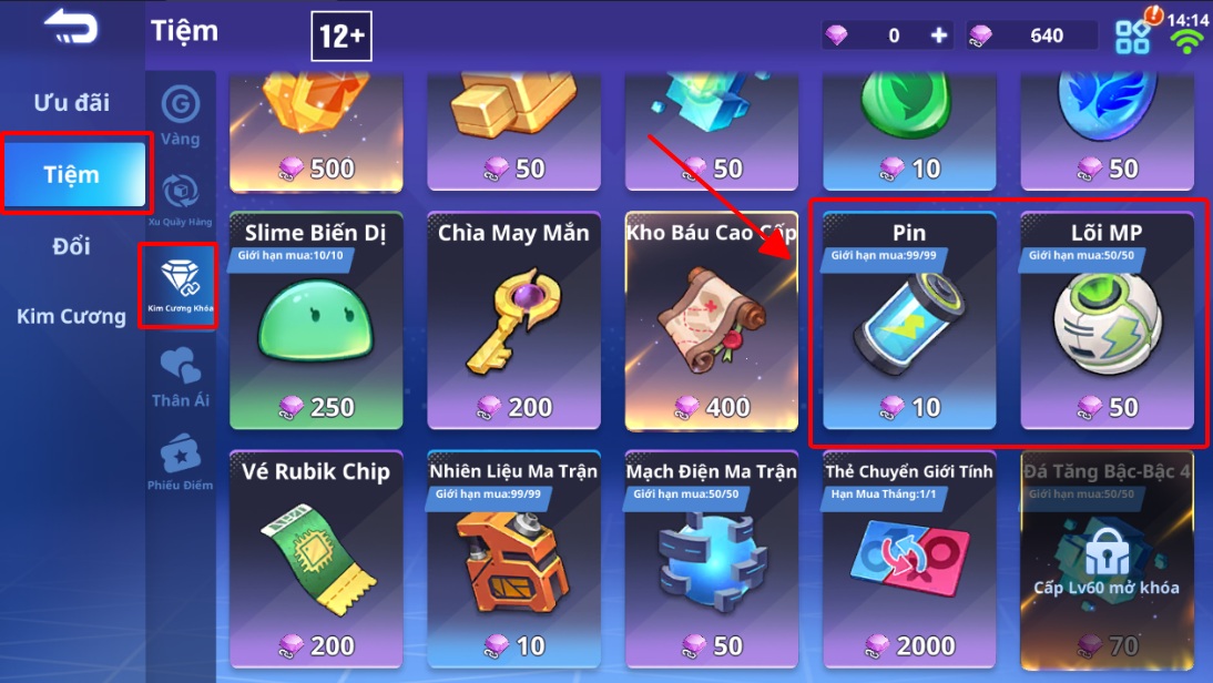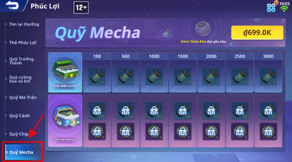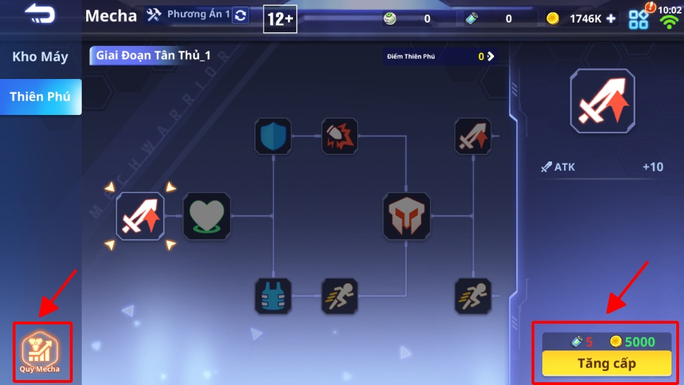 Bước 4: Tại Thiên Phú, Shooter có thể sử dụng nguyên liệu Pin và Lõi MP để nâng cấp các chỉ số liên qua cho Mecha. Hai nguyên liệu có thể kiếm được từ mua Gói Quỹ Mecha, chi tiêu Kim Cương Khóa và tham gia các hoạt động tại Guild để nhận thưởng.